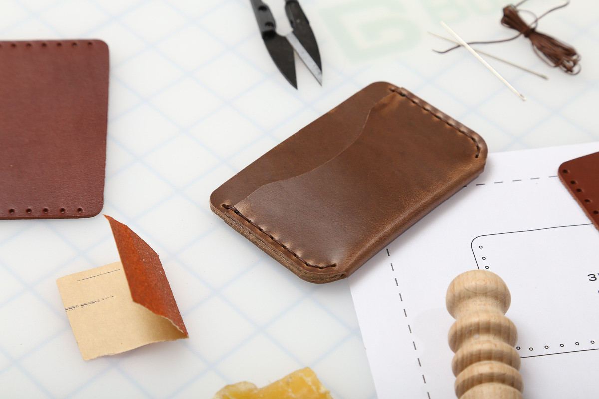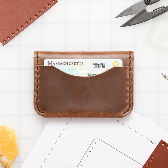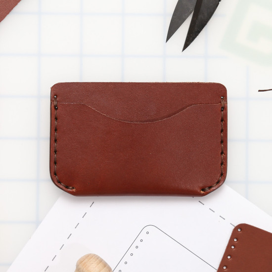 This super simple wallet is a great first time leather project. With just a small amount of stitching, you will quickly learn all the basic hand stitching skills in no time and have a super cool wallet to show for it! This wallet features a rounded silhouette and three pockets for cards, IDs, and cash.