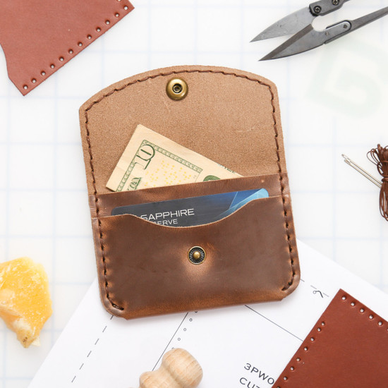 This Snap Wallet looks good and keeps your loose items secure! With the snap already installed to the leather, this DIY kit is fun and allows you to focus on your stitching skills. This snap wallet keeps your inside cards, cash and coins locked in, with one exterior pocket on the back for quick access to your loyalty cards.
