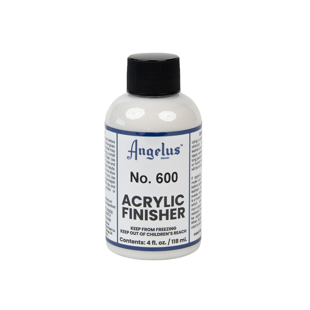 Angelus Acrylic Finisher, No. 600, Regular is a professional, water-based clear topcoat designed to seal and protect leather after painting. Formulated specifically for use over Angelus Acrylic Leather Paint, it creates a flexible protective layer that helps guard against minor scratches, scuffs, and wear while delivering a subtle, factory-style sheen.