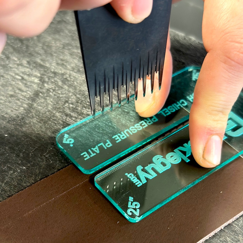 This tool is used when removing pricking irons or punches from leather. The teeth will pull out of the leather while the leather stays in place. Additionally, there are 4 radii edges for cutting accurate radii (0.25", 0.5", 0.75", 1").