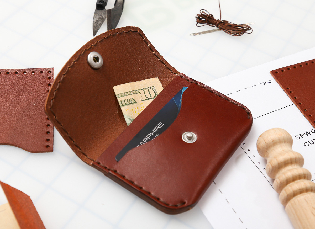 This Snap Wallet looks good and keeps your loose items secure! With the snap already installed to the leather, this DIY kit is fun and allows you to focus on your stitching skills. This snap wallet keeps your inside cards, cash and coins locked in, with one exterior pocket on the back for quick access to your loyalty cards.
