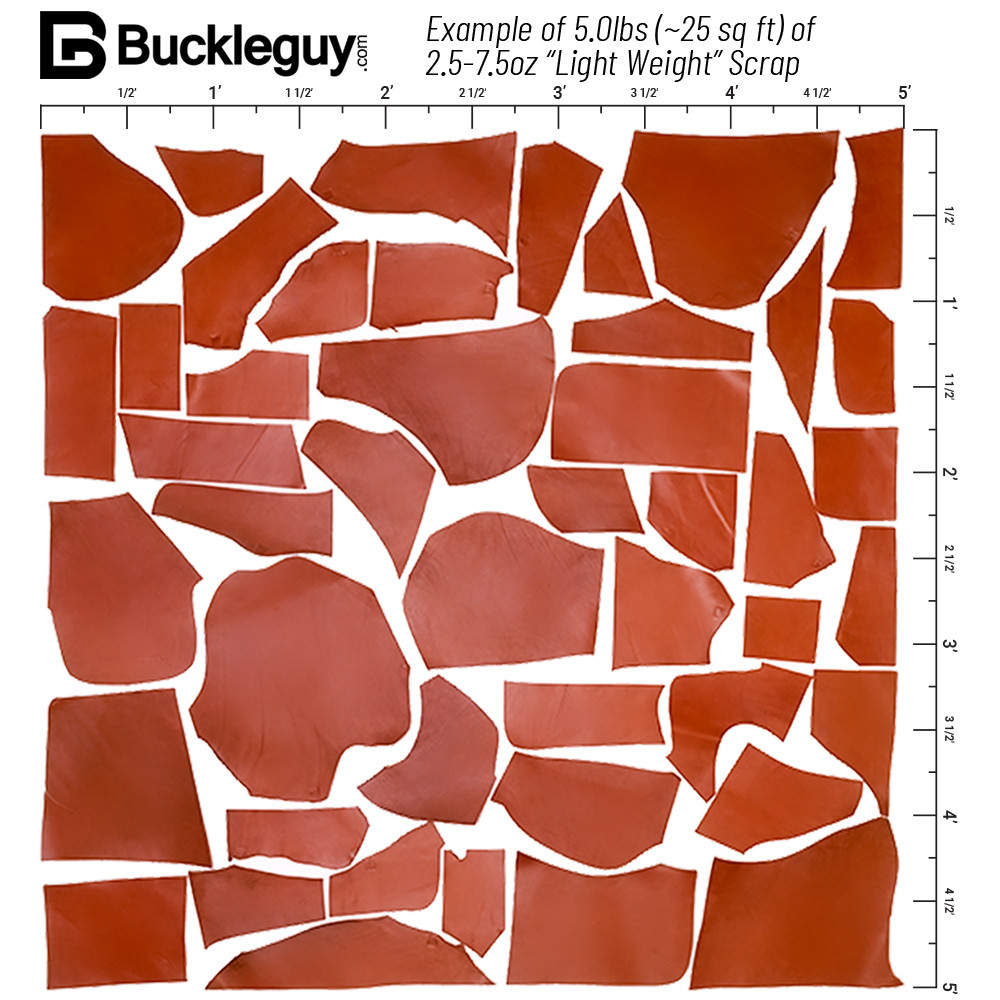 • Scrap bundles come with both large and small remnant pieces cut from all areas of the hide. These pieces are great for small leather items, trim, repairs, practice, and many other projects.