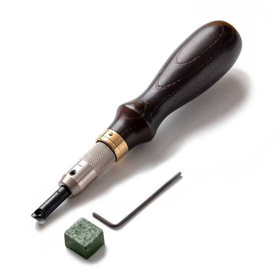 A groover tool is used to cut out a U shaped groove in leather. This tool is most commonly used folding and creasing the leather at the groove. It can also be used to create recesses in leather for placing hidden magnets or other parts. The blade can be removed with the Allen key to either replace it, or to substitute in swivel knife blades into the handle. The tool also comes with polishing compound to sharpen the blade.